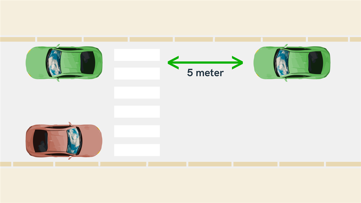 På illustrasjonen under står den røde bilen feilparkert fordi den er for nærme krysset, mens den grønne står korrekt fordi den står parkert mer enn 5 meter fra krysset.